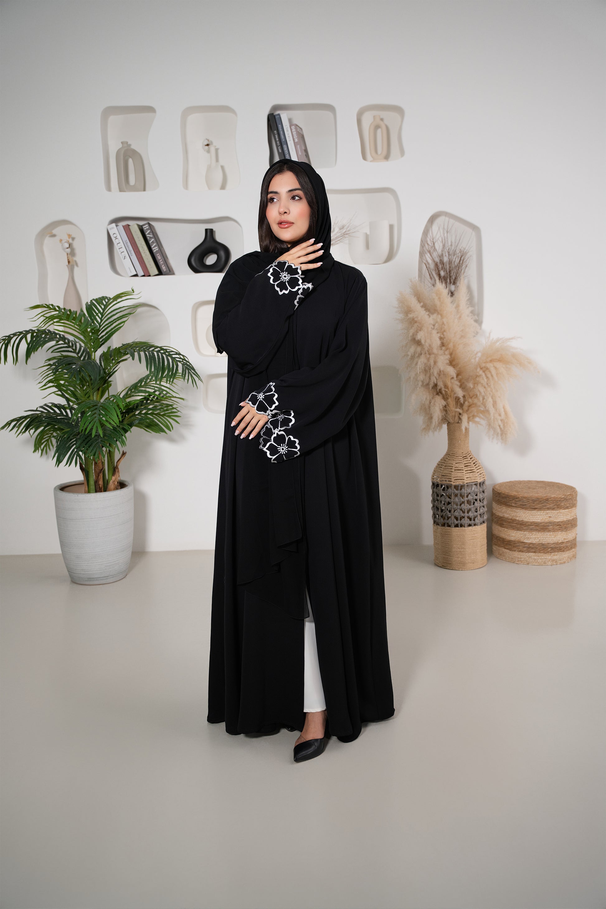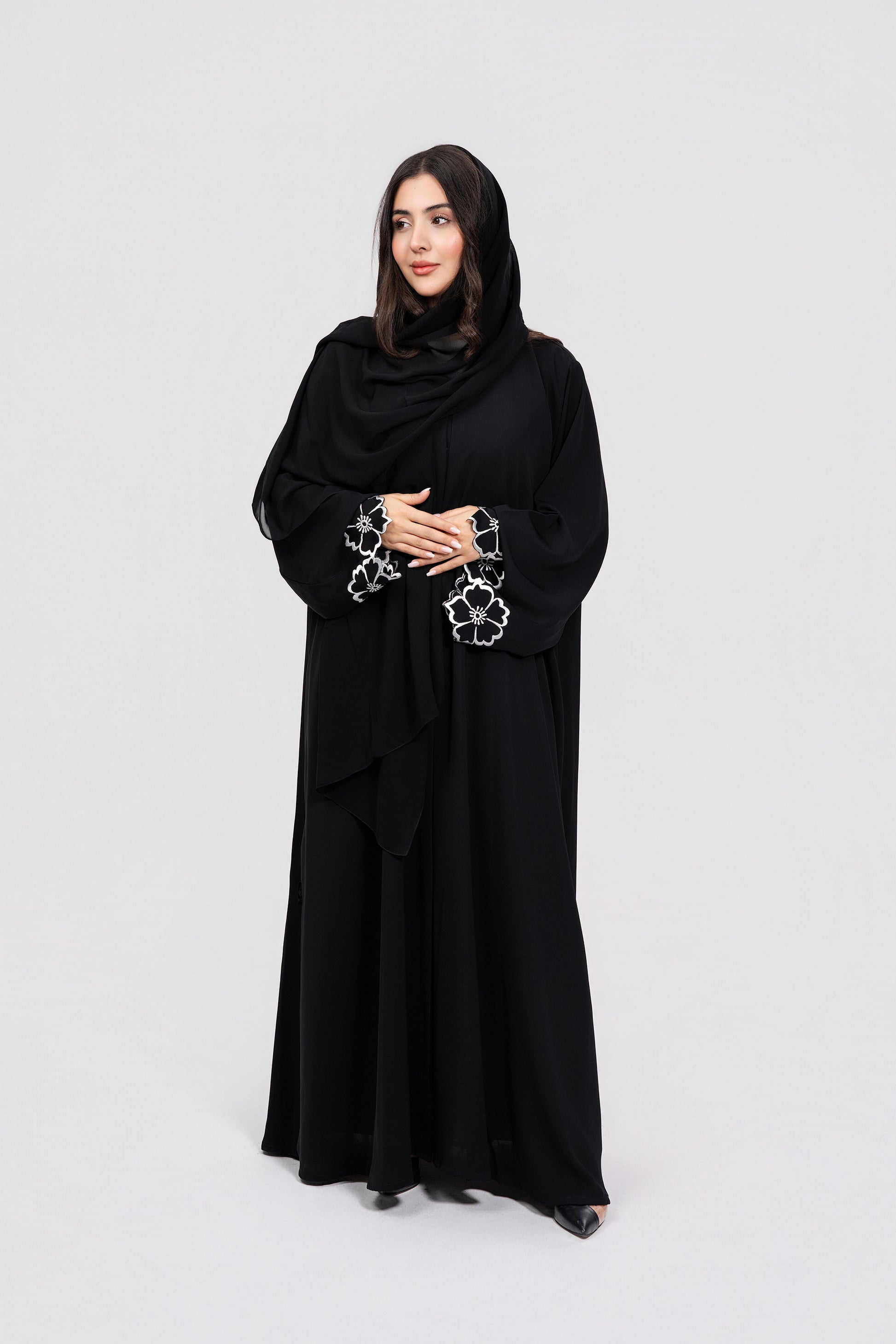 Discover timeless elegance with our stunning Black Nida Abaya. It features intricate, eye-catching floral hand-work on the wide cuffs, adding a touch of modern artistry to a classic silhouette. Perfectly paired with the included matching Black Shaila, this abaya transitions effortlessly from formal events to sophisticated everyday wear.