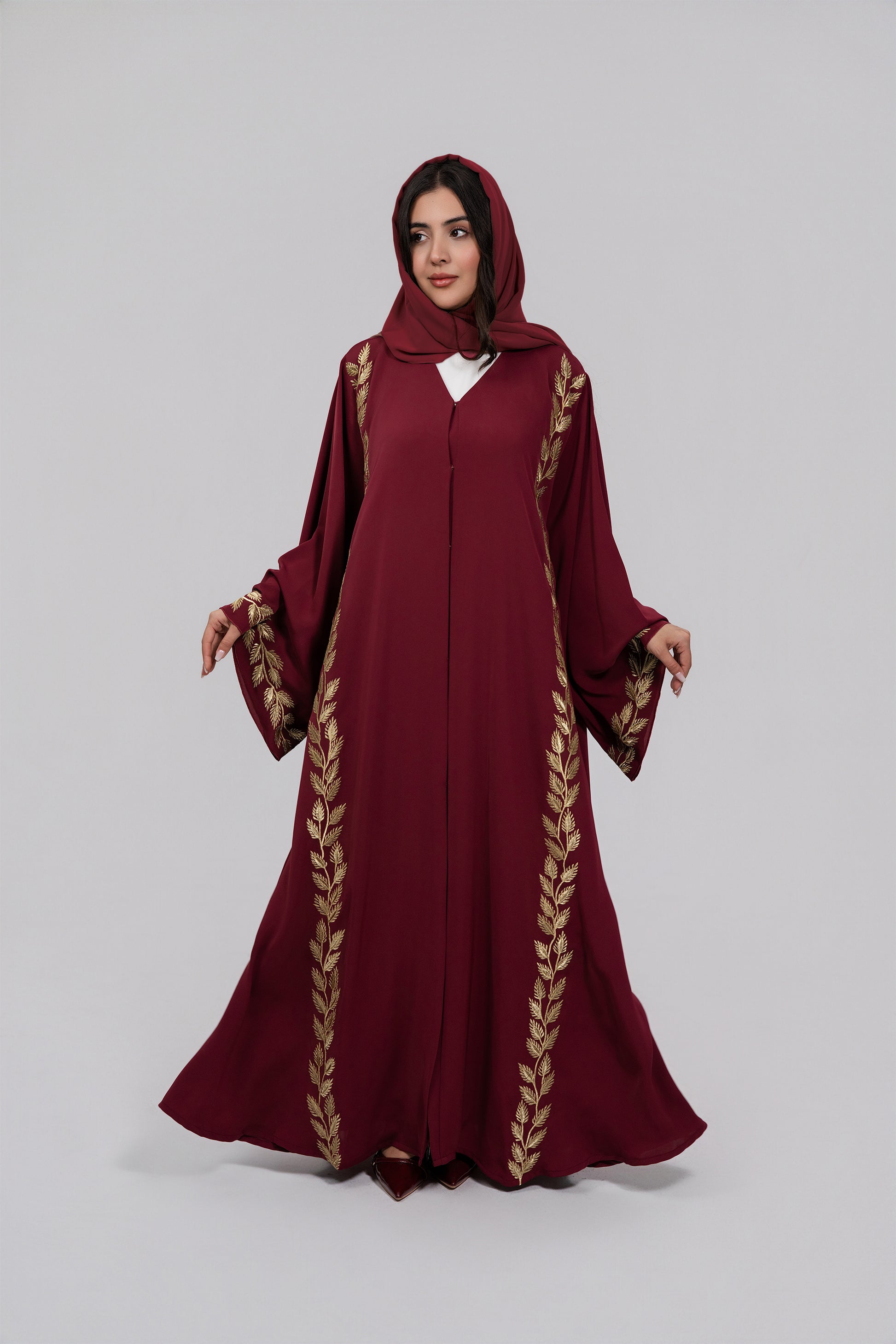 Maroon Elegance with Intricate Gold Embroidery. Elevate your evening wear with our luxurious Nida fabric abaya, featuring stunning gold leaf embroidery. Perfect for formal events, Eid celebrations, or weddings. Shop the latest modest fashion collection now!
