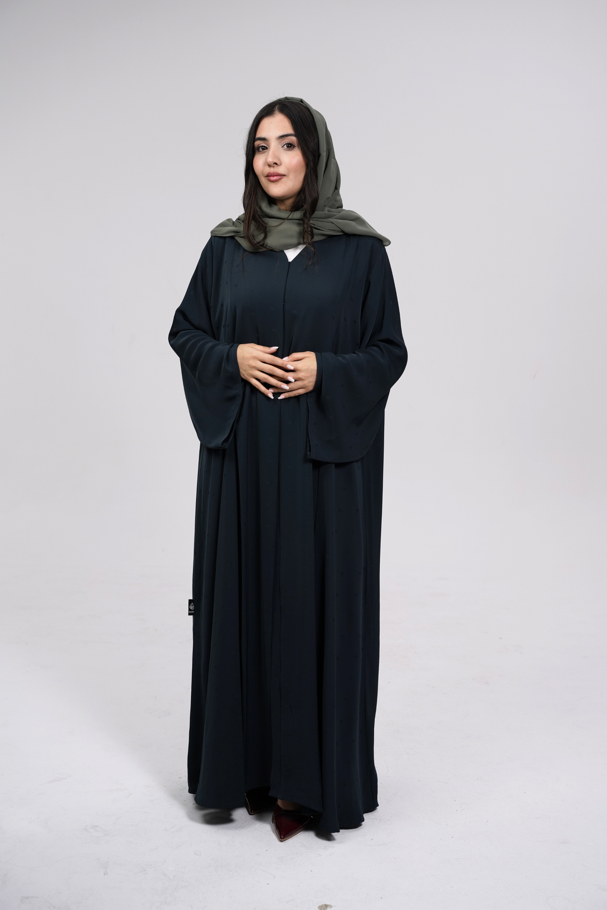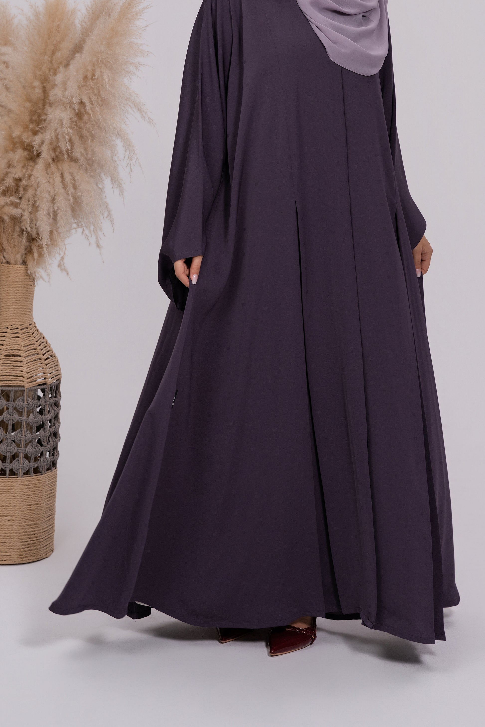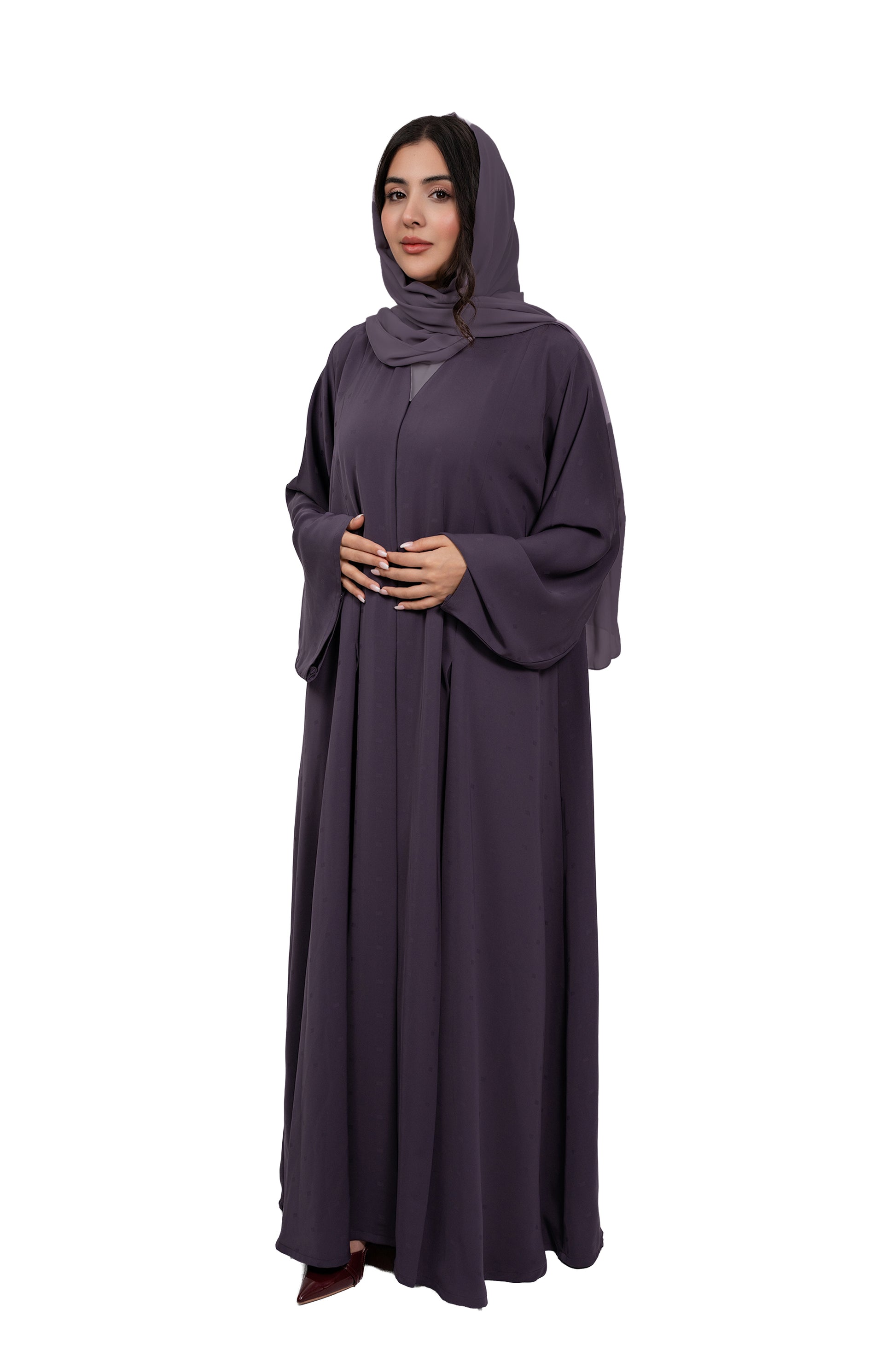 Discover the elegance of texture with this exquisite Dark Purple Abaya. Made from premium Nida fabric, the material features a sophisticated, all-over subtle box pattern jacquard weave. This monochromatic texture adds depth and movement, making the abaya luxurious without relying on heavy embroidery. Paired perfectly with the model's light lilac shaila, this piece is ideal for upscale events, special occasions, or refined daily wear.